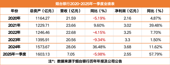 步入2025年一季度,烟台银行的营收呈现负增长,净利润较同期增速超50%。一季报显示,截至报告期末,烟台银行总资产规模达到1603.13亿元,同比增长实现营业收入7.05亿元,同比下降5.98%;实现净利润2.55亿元,同比增长57.79%。