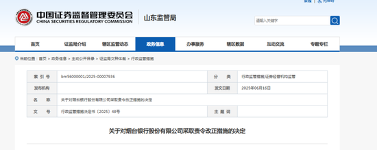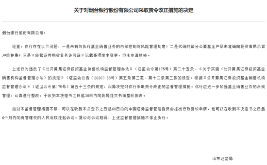6月30日,中国证监会山东监管局官网发布对烟台银行责令整改的行政监管措施决定书,披露了烟台银行在基金销售业务合规管理等方面的相关问题。