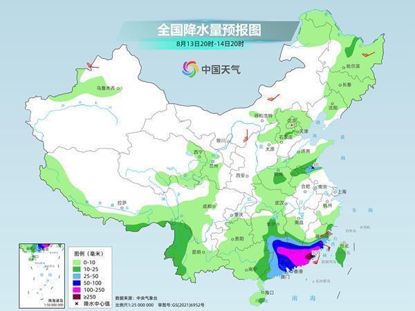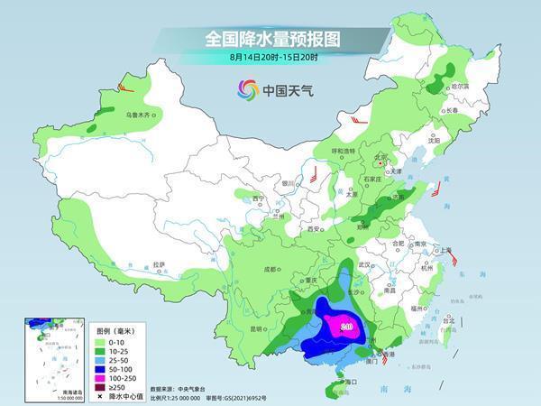 13日至15日,台湾岛、福建南部、广东、广西、江西南部、湖南南部、贵州有大到暴雨,部分地区大暴雨,局地特大暴雨,部分地区累计降水量100至250毫米,局地300至400毫米。